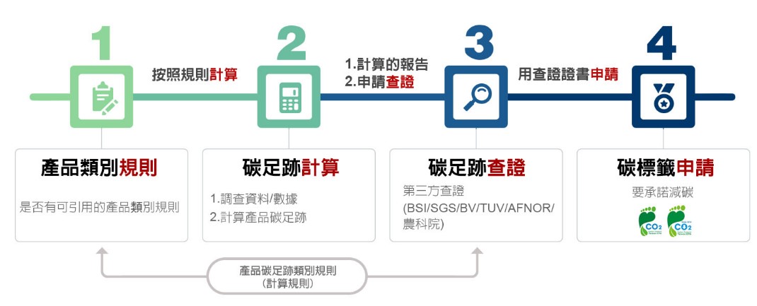 2.「碳標籤」:碳標籤制度的目的,讓產品各階段的碳排放來源透明化,促使企業調整其產品碳排放量較大的製程,也能促使消費者正確地使用產品,以達到減低產品碳排放量的最佳效益。進行碳足跡計算時,必須以環境部CF-PCR作為界定計算範疇的依據去計算,並經第三方查證後,另向環境部申請,透過嚴謹的審查程序,審核頒發碳標籤。