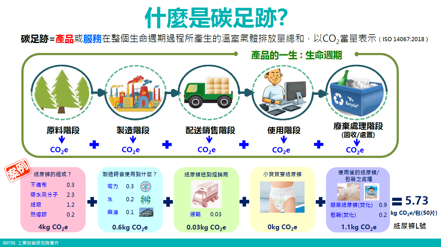 碳足跡為計算特定「產品」或「服務」生命週期評估範圍中的溫室氣體排放和移除量;